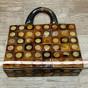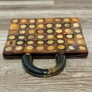 Chan Luu tortoise shell tiles on silk square handbag with silk lining, small inner zipper pocket, and magnetic closure. Like new.