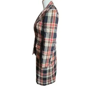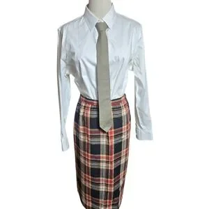 Vintage 1970s Collectors item wool plaid suit. Fully lined with no.stretch. Jacket has in button closure. Skirt is fully lined with hook and eye and zip. Also buttons on slit. I am throwing in the Jones of New Yor White button down And Banana Republic Tie because it all looks good together! Good overall condition