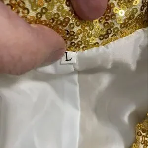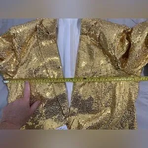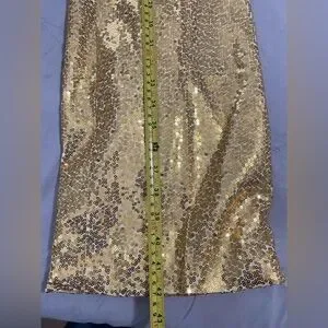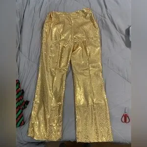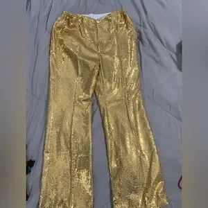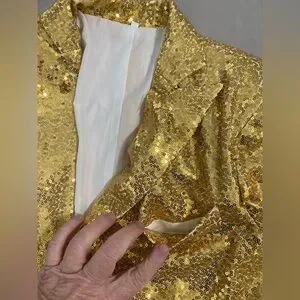 Shine in this stunning gold women's pantsuit, perfect for elegant occasions. Make a statement in this gold fully lined gold sequined jacket and pants. The shimmering fabric adds a touch of luxury to any occasion. In perfect new condition with tags.
