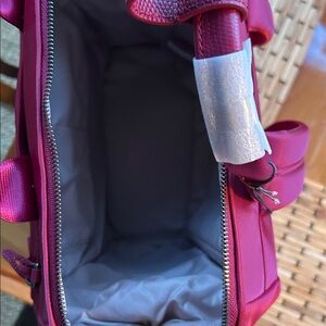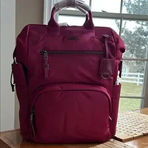 Elegant Tumi backpack in a deep burgundy shade. Ideal for daily adventures. Bag is new with tags measures 16 x 11 x 6 holds a 15 inch laptop- gunmetal hardware