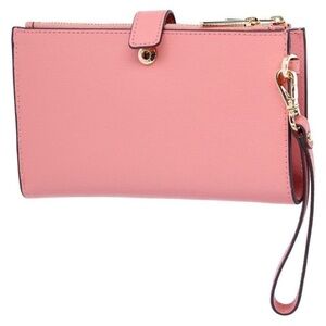 Elegant Michael Kors wristlet in blush pink. Features a sleek strap and gold-tone accents. Ideal for versatile styling.