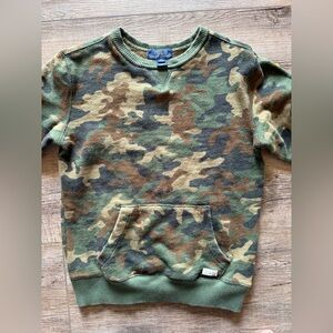 Cozy kids hoodie with a green camouflage design. Features a front pocket and ribbed cuffs.
