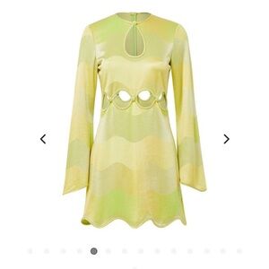 Vibrant mini dress with keyhole neckline. Features wave pattern and cut-out details. Long sleeves with a scalloped hem.