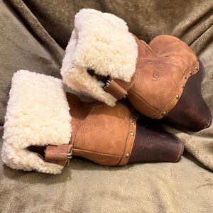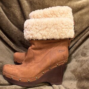 Stylish UGG wedge boots with cozy shearling lining that can be worn cuffed or uncuffed. In good used condition. Size 8