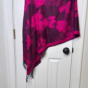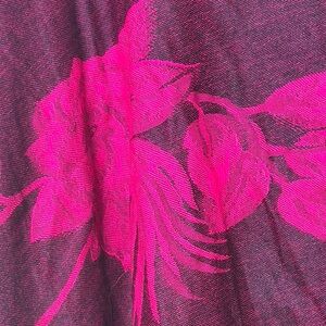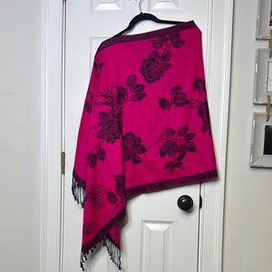 This eye-catching wrap features a vibrant pink hue adorned with black floral patterns, complemented by elegant black fringe along the edges. Crafted from lightweight fabric, it offers versatility as a scarf, shawl, or wrap, making it a stylish addition to any ensemble. this is reversible!