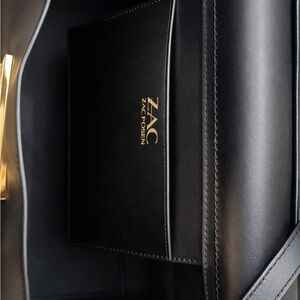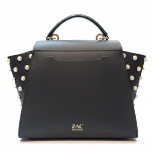 Elegant black satchel with gold hardware. Features pearl embellishments. Stylish and sophisticated design.