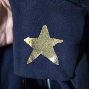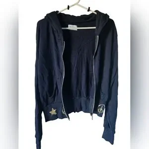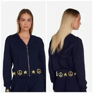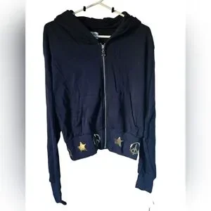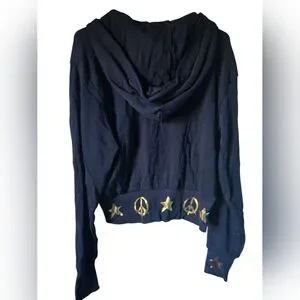 Navy blue zipper hoodie, with symbols of peace and stars adorning the hem and wrists.