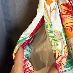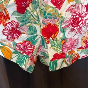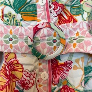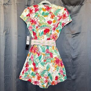 Vibrant floral romper with a V-neck and matching belt. Perfect for a stylish look.