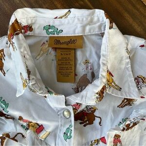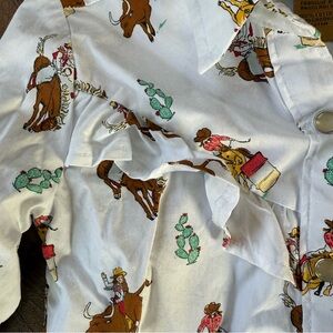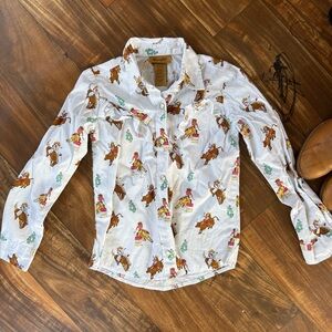 Who’s the prettiest little barrel racer you know? She needs this shirt. Super cute print and ruffle detail, and pearl snaps for the classic western flair.