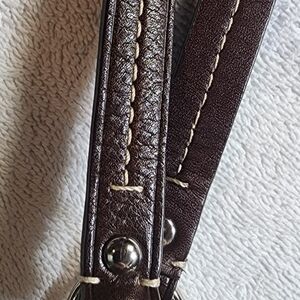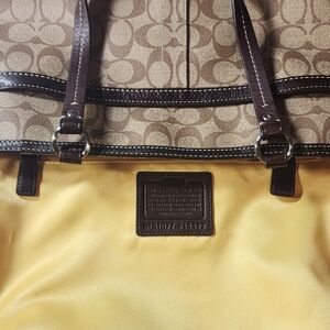 Material: Coated canvas with leather trim. Silvertone Hardware. Exterior logo plaque.Double flat handles.
