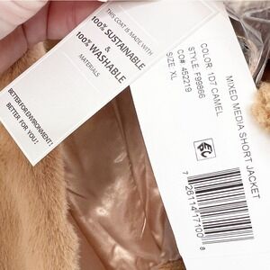 New with tag French Connection mixed media short jacket in camel. This stylish outerwear piece combines luxurious faux fur with a textured teddy fabric for a unique look. Designed with a classic collar and a smooth satin lining, this jacket offers both warmth and chic appeal. It features a button-front closure and convenient side pockets. New with tags. No flaws. Size XL. Made in China. 100% polyester. Machine wash cold.