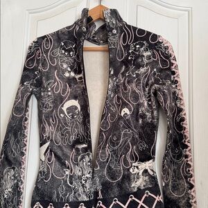 lenght is aroun 33”, back zipper clousure, high neck, long sleeves, cute bow lace detail and characters, in good used condition