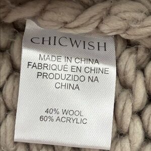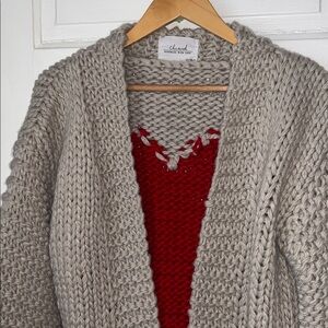 Chicwish Key to my Heart hand-knit cardigan sweater. Super chunky gray knit with red knit heart on the back. Oversized, slouchy fit. Wool blend. The color is a beige-gray. No flaws.