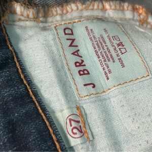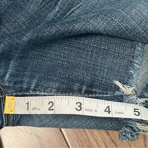 Stylish blue denim shorts. Features classic five-pocket design. Frayed hem for a casual look.