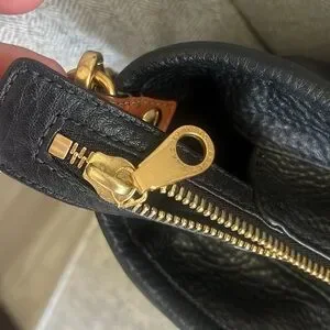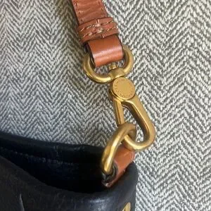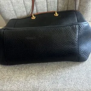 Stylish black leather bag with tan handles. Gold hardware details.