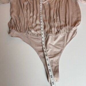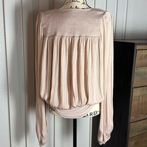 Beautiful Intimately Free People long sleeve bodysuit in a soft blush pink tone. Features a flowy draped front, deep V neckline, and smocked shoulder panel detail for a romantic boho look. Bottom snap closure for easy wear.