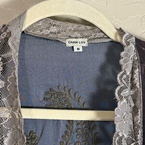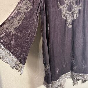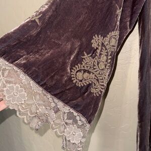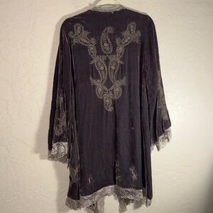 Chan Luu crushed velvet embroidered kimono cardigan shawl sweater duster. Lace trim. Tie front. Bell sleeves. Size medium. Approximate measurements