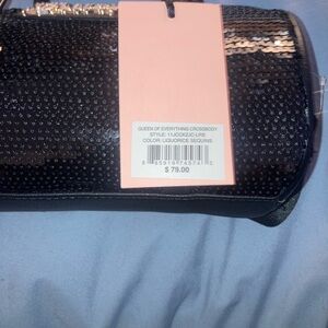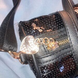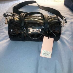 Elegant barrel bag with shimmering black sequins. Features gold accents and Juicy Couture logo. Includes a versatile strap.