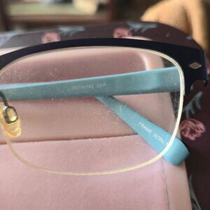 Brand: Eddie BauerSize: 52-19-140 Lens Vertical (B): 35mm These authentic Eddie Bauer 8222 frames offer a clean, rectangular silhouette in a classic navy and teal/light blue colorway. Built for durability, these frames feature standard fixed hinges for a traditional, sturdy fit. The screws may need tightening. Condition: Hinges are standard hinges in good working order (not spring-loaded). Nose pads have yellowing / age-related wear. Most optical shops can replace these easily for a nominal fee or free of charge. Lenses: Sale is for frames only. Existing prescription lenses will need to be replaced by your optician. Some of the light blue paint has chipped off the arms. See pictures as they form part of the description.  These frames are a discontinued model. A rare find for replacement parts or a unique style. These frames are perfect for those who love the sturdy, reliable build of quality of the mid 2010s.