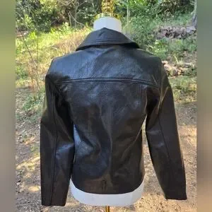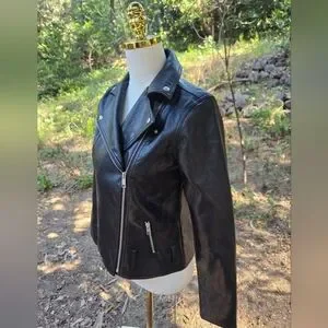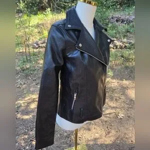 Elevate your style with this sleek black faux leather biker jacket. Perfect for any occasion, it offers both comfort and edge.