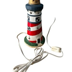 (R)Illuminate your space with this charming lighthouse ceramic lamp. Featuring vibrant red and blue stripes, it adds a nautical touch to any decor. Perfect for creating a cozy ambiance.