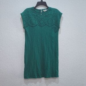 Boden women's emerald green 100% cotton cutwork t shirt dress. Cutout floral design on chest, pom pom details around neckline and sleeves, keyhole design on back with button and loop closure. US size 2 regular.