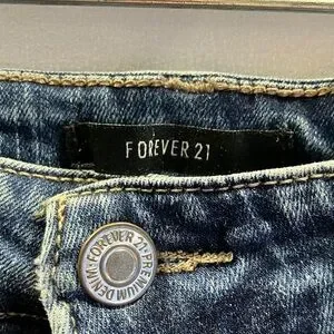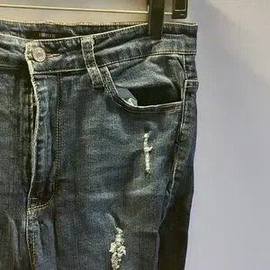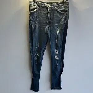 Trendy dark blue jeans with distressed details. Ideal for everyday style. W 28”, outer leg 38”, inner leg 25”.