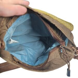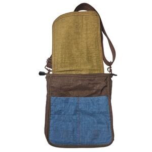 This is a crossbody bag from Life is Good. It is in EXCELLENT PRE-OWNED CONDITION. It has an adjustable crossbody strap, removable strap, magnetic closure on outer flap, zipper closure for inside compartment, and two slip pockets under flap on the blue section of the bag. The main compartment has no zippered pockets.