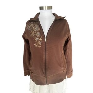 y2k St Johns Bay Women Floral Embroidered Zip Up Hoodie Sweatshirt M Brown