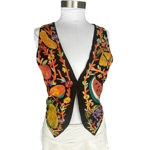Keywords: embroidered vest, fruit print, floral embroidery, sleeveless top, bohemian vest, whimsical fashion, summer layering, garden party attire, playful top, unique embroidery, statement vest, casual chic