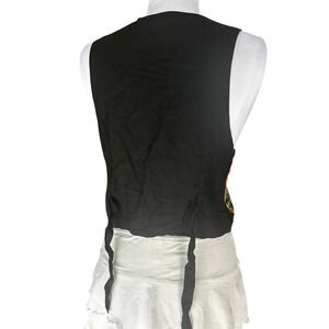 Vibrant fruit and floral embroidery bursts with life on this eye-catching black vest. Intricate stitching showcases juicy watermelons, plump grapes, bright oranges, and cheerful blossoms, creating a wearable garden that will surely turn heads. The flattering V-neckline and sleeveless design make it a perfect layering piece for warmer days or a playful addition to any outfit. Tie back closure offers adjustability for a comfortable fit. Elevate your casual look for a summer picnic, a garden party, or a fun day out shopping.