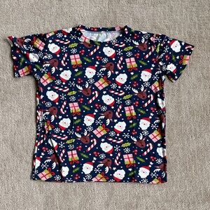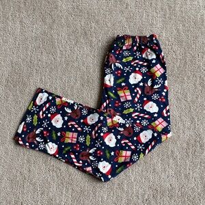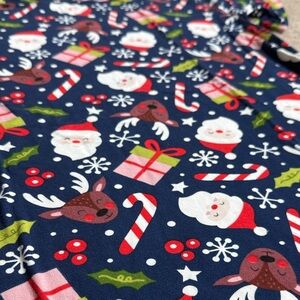 Get for the holidays with these festive navy blue pajamas featuring a cheerful Santa, candycane, and reindeer print. Perfect for cozy nights and holiday fun.
