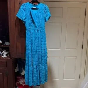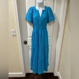Beautiful Blue maxi dress with eyelet design. Features short sleeves and V-neck. Ideal for versatile wear.
