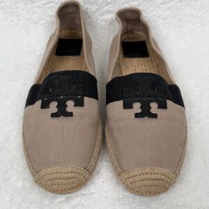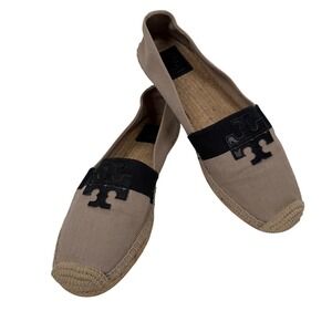 Tory Burch Weston Canvas and Leather Espadrille Flats Beige Black Women Size 9.5