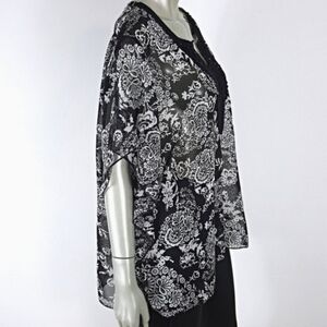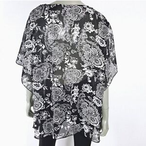 Elegant Overdrive flutter sleeve blouse featuring beautiful black lace at neckline. Excellent condition.