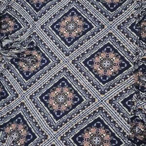 Stylish blouse with geometric blue and pink design. Features ruffled hem and tie neckline. size medium Measurements are in the photos