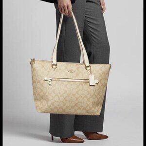 Coach F79609 Large Gallery Tote Bag Signature Canvas Leather Khaki Chalk Gold