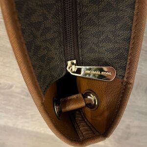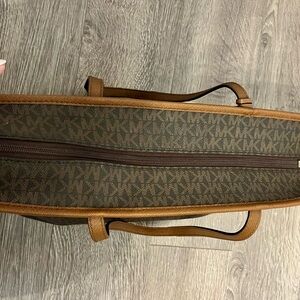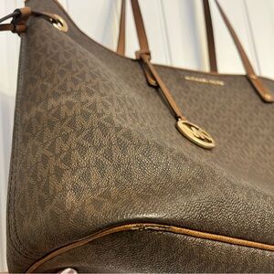 Elegant Michael Kors tote in dark brown. Features signature MK pattern. Perfect for daily use. Some wearing on the bottom corners and straps as seen in photos - price reflects this condition. Still lots of life left! Zipper works perfect.