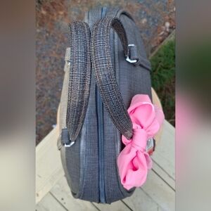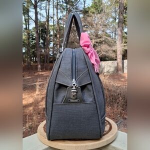 Vintage 1960's American Tourister Tiara grey tweed look carry-on satchel overnight travel weekender bag. Features two interior zip pockets, top zip and lock closure with 2 keys, luggage tag, grey cotton quilted floral interior, and new vintage Nasharr Freres pink polyester twilly scarf. Measures 16×14.5×8 with a double handle drop of 7 inches