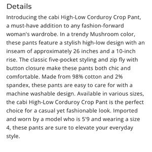CAbi Jeans Corduroy High-Low Crop Pants Mushroom 12 NWT NEW