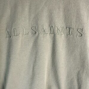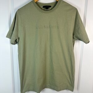 Premium AllSaints T‑shirt in sage green with subtle embroidered logo at chest. Classic relaxed fit (runs slightly oversized) — ideal unisex piece. Soft cotton, made in Portugal, excellent pre‑owned condition with minimal wear. Great with jeans, shorts, or layering under jackets.