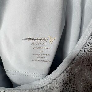 Old Navy Medium-Support PowerSoft Racerback Sports Bra Blue Ice Mosaic Size 4X. New without tags, Old Navy has been mark through with permanent marker. Armpit to pit is 22.5 inches. Length from the shoulder is about 18.5 inches. Light compression. Deep scoop neck. Wide straps with racerback. Shaped cups with soft removable pads. Plush elastic banded hem to keep you from chafing. Go dry moisture wicking keeps you dry and comfortable. Provides medium support for cups A-C and light support for cups D/DD. Fitted through the body. Hits at ribcage. 77% polyester, 23% spandex. Machine washable, remove pads before washing.