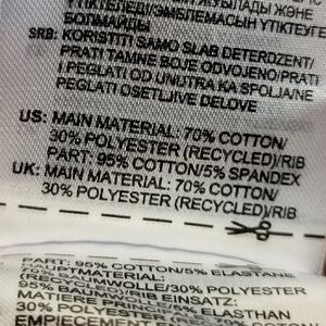 It features a relaxed fit, a ribbed crewneck, and is made from a blend of 70% cotton and 30% recycled polyester fleece. It has ribbed cuffs and a ribbed hem for comfort.