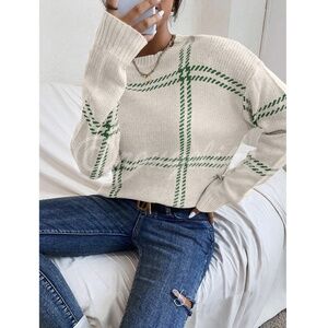 Stylish crew neck sweater. Cream base with green plaid pattern. Perfect for casual wear.