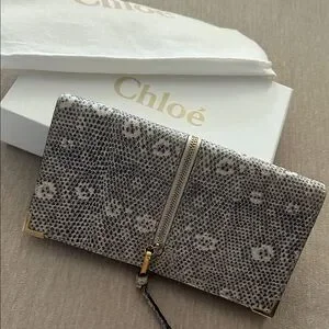 Elegant Chloe wallet. Features a gray and black pattern. Gold-tone accents. Sleek and stylish design.