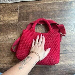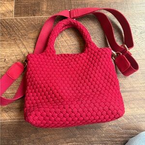 This stylish red woven handbag is perfect for any occasion. Its vibrant color adds a pop of elegance to your outfit. Ideal for daily use or special events. Naghedi look alike