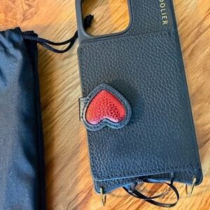 Elegant Bandolier phone case leather in black. Features a striking red heart detail. Ideal for stylish mobility.