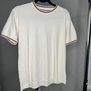 Ringer style with brown, black, and white striped trim at collar and sleeves.
