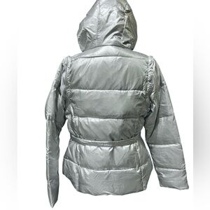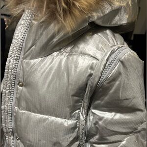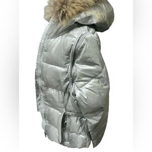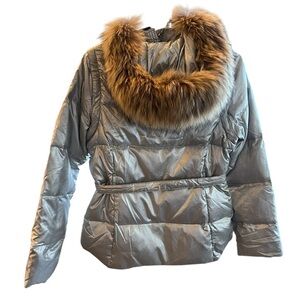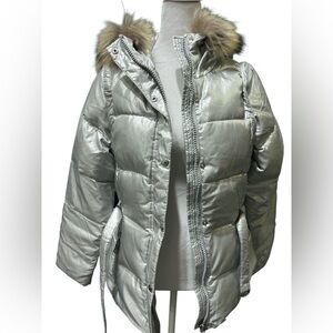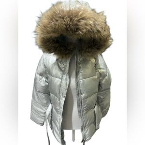 Andrew Marc Silver Puffer Jacket with Faux Fur Hood