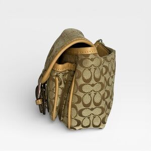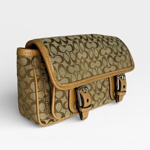 Vintage Coach Signature Jacquard Fanny Pack in tan canvas with smooth leather trim and silver-tone hardware. Features double buckle front pockets, secure snap-closure flap, adjustable strap to wear as a belt bag or crossbody, and a zippered interior pocket. Classic Y2K Coach style — compact, lightweight, and super versatile.